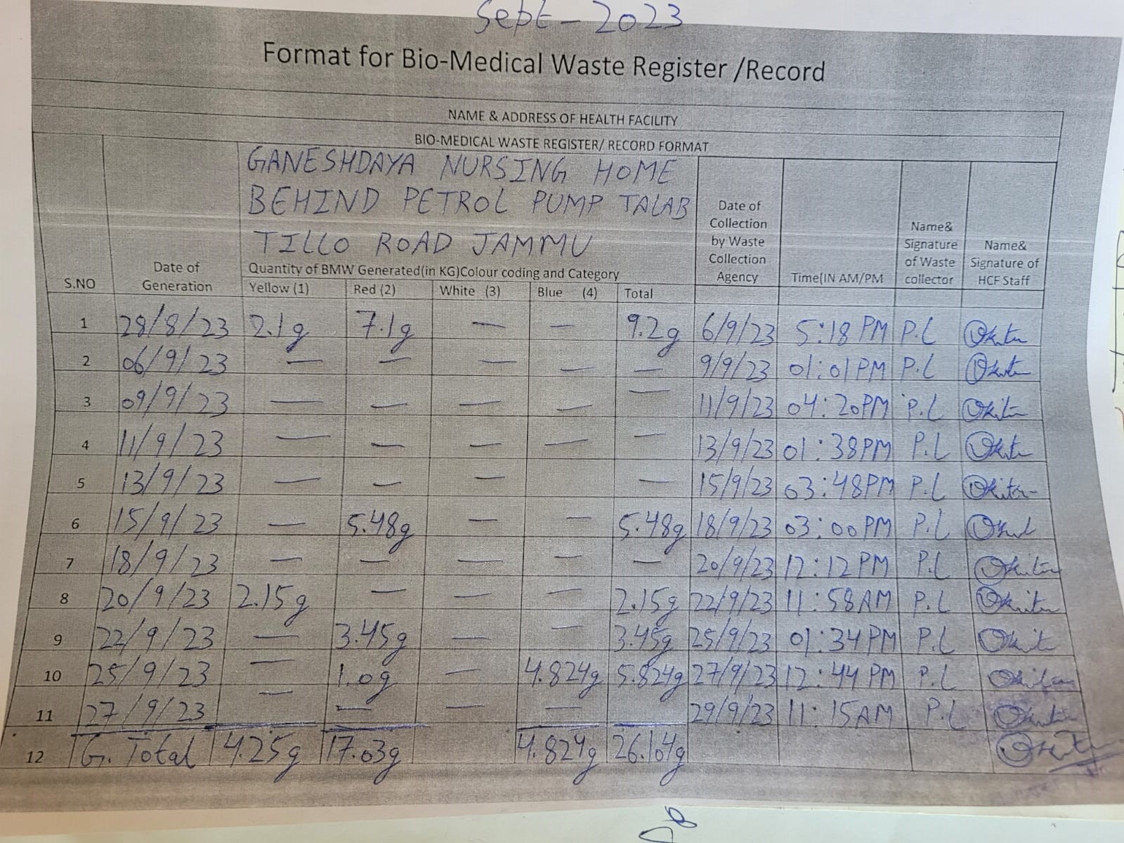 Monthly Report of Bio Medical Waste for the Month of September 2023.