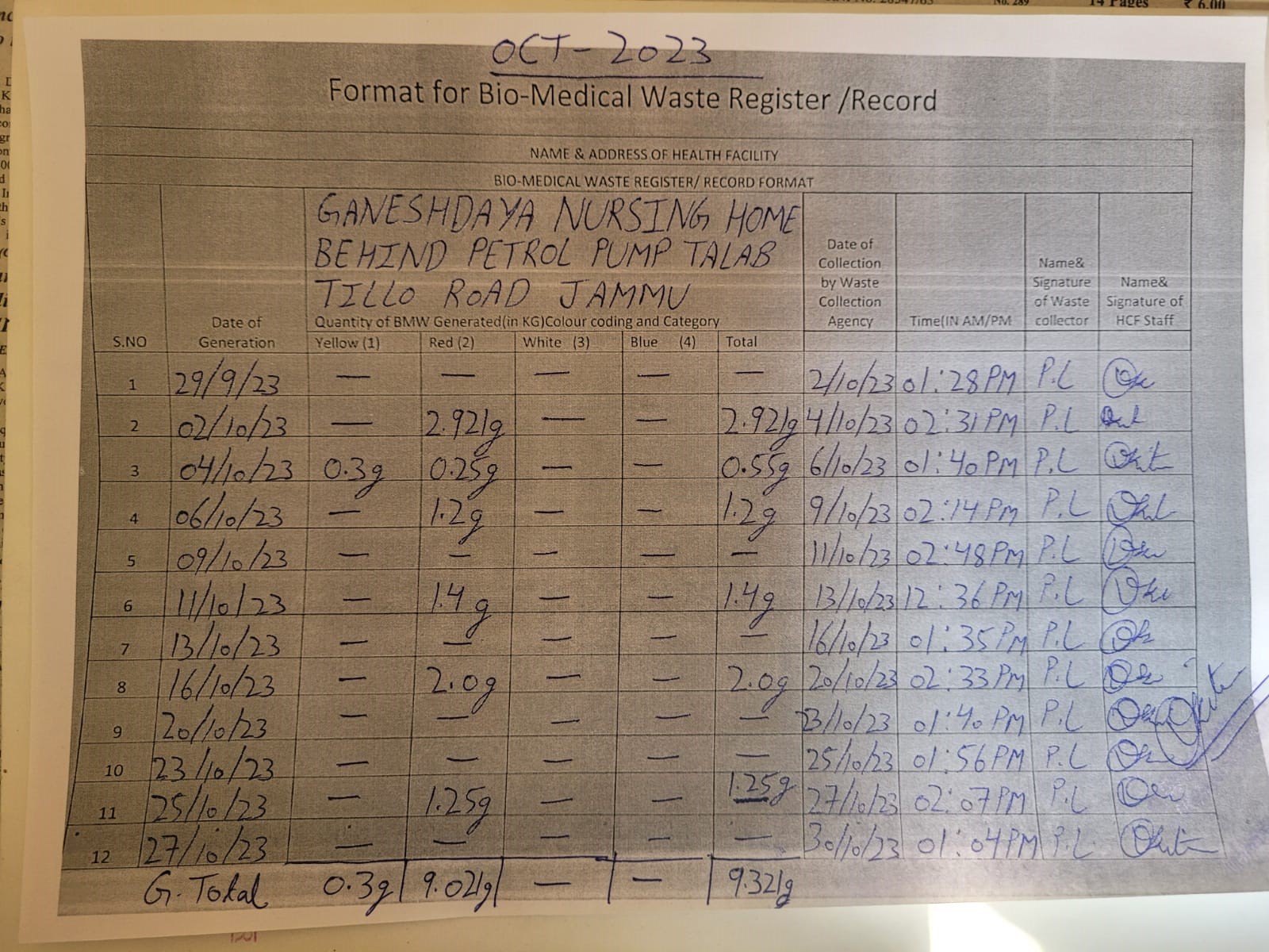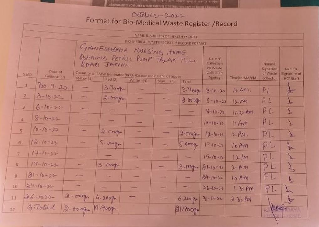 Monthly Report of Bio Medical Waste for the Month of October 2023.