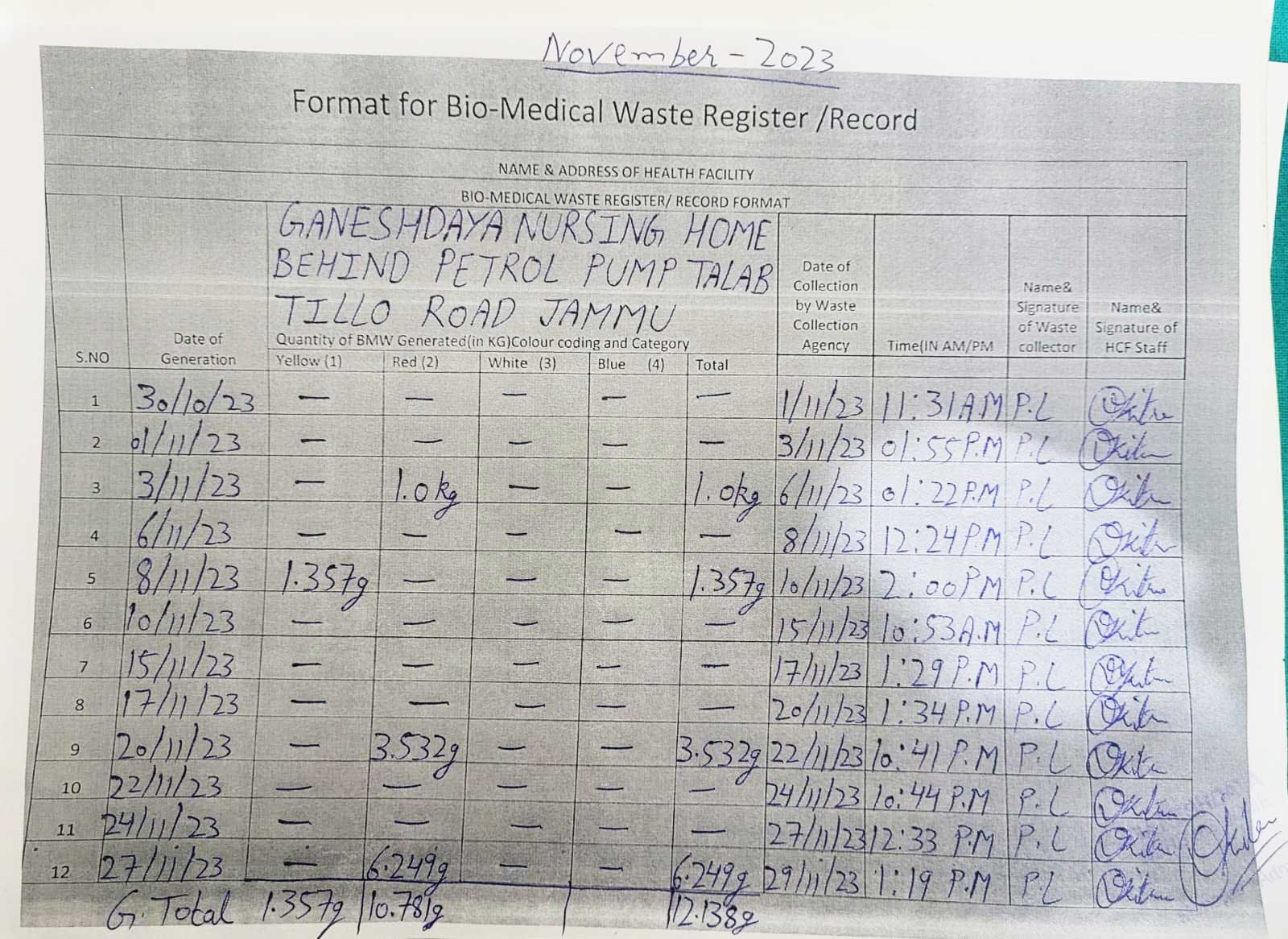 Monthly Report of Bio Medical Waste for the Month of November 2023.
