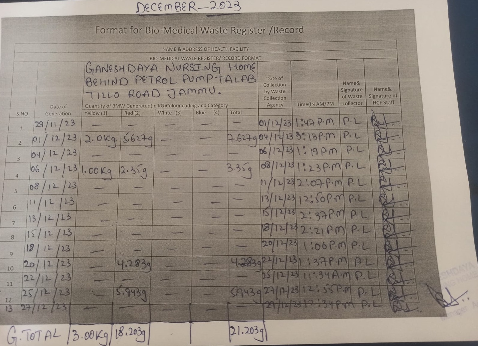 Monthly Report of Bio Medical Waste for the Month of December 2023.